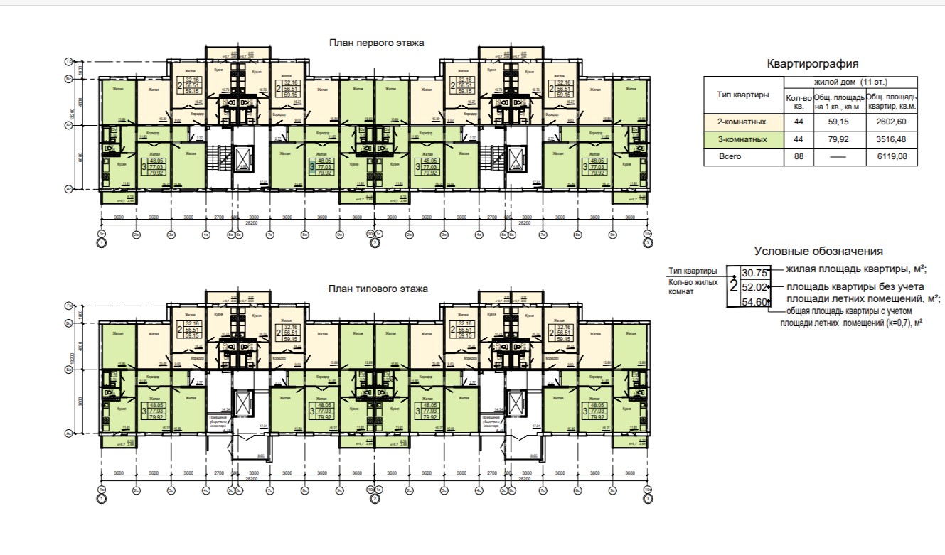 Запроектировано 88 квартир по 4 квартиры на этаже каждой секции с набором квартир 3-2-2-3: 2-комнатных – 44, 3-комнатных – 44. Высота этажа – 2,8 м.